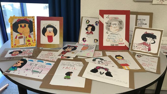 Se han reunido en el CDI del collège y durante cerca de dos horas se han dedicado a explicar y contar a los demás lo que han aprendido del autor elegido este curso que no es ni más ni menos que el gran Quino. De toda su extensa obra se han centrado en su personaje más conocido a nivel internacional que acaba de cumplir el año pasado ¡60 años! y no es otra que Mafalda.