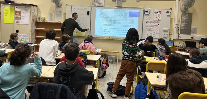 Cette année encore, le collège Michelet soigne la liaison CM2-6e, à travers une série d’interventions dans les écoles élémentaires du secteur. Lundi 19 janvier, M.CHERCHOUR, professeur de Lettres, a donné cours une première fois à la classe de CM2 de Mmes ESCALE et VERDIER, à l’élémentaire Michelet. Les trois enseignants ont échangé afin d’élaborer un support en accord avec le programme de littérature en CM2.